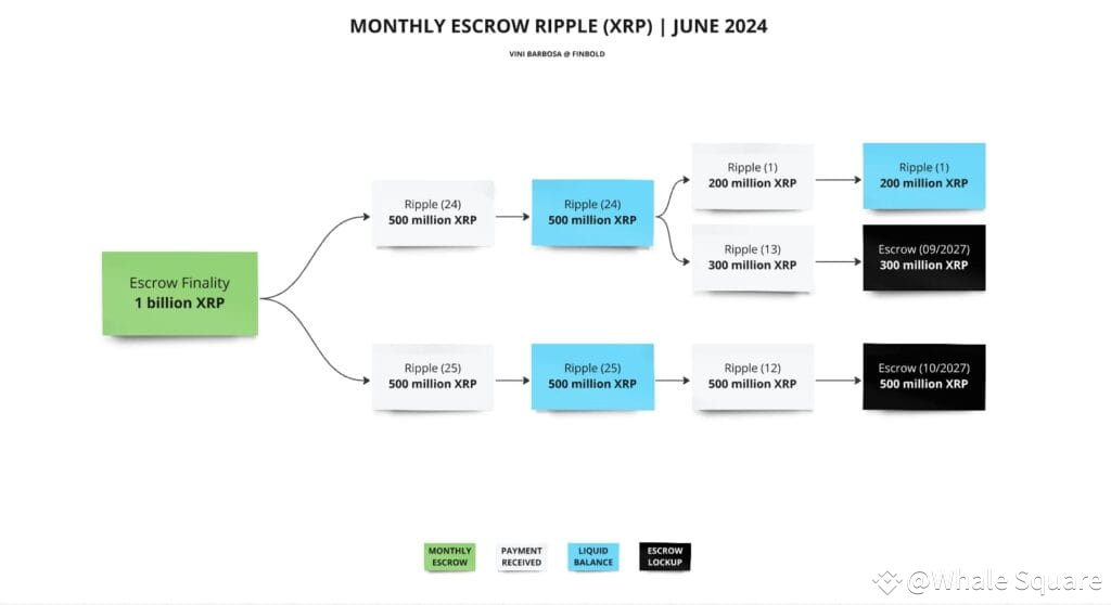 Since 2017, Ripple has been unlocking 1 billion tokens every month through escrows. As of May 2024, the company uses 'Ripple (24)' and 'Ripple (25)' wallets to manage these escrows, which will continue until January 2025. On July 1, 'Ripple (24)' will unlock 500 million XRP in two escrows (100 million and 400 million), while 'Ripple (25)' will unlock a single escrow of 500 million tokens.