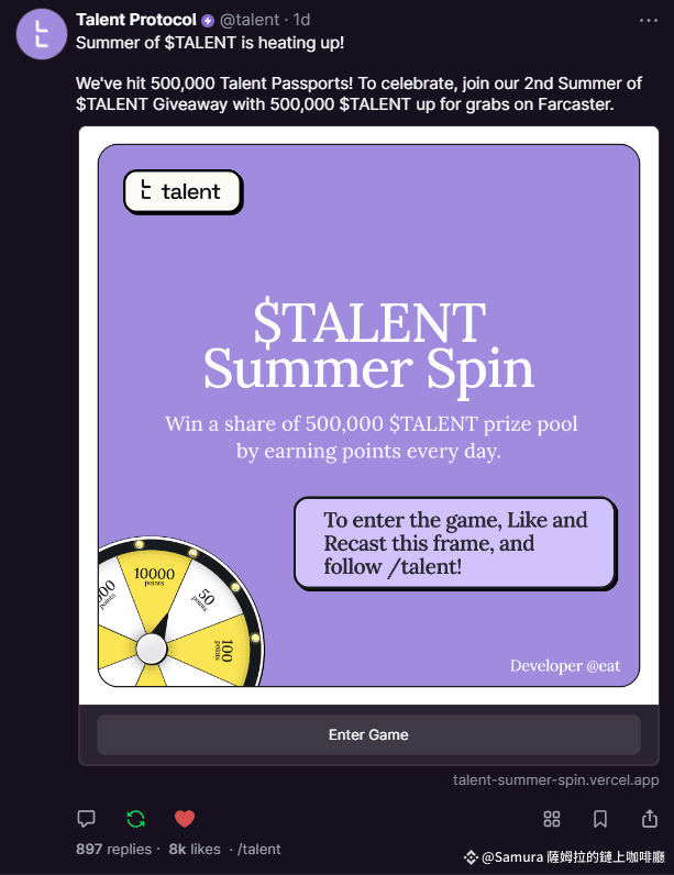 3. Talent Protocol 有個額外活動在 Farcaster 社交平台上, 可以轉轉盤獲得任意分數