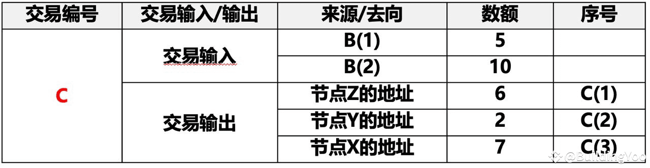输入:节点X的10枚比特币中的3枚,节点Y的5枚比特币中的3枚(来自之前交易B)。