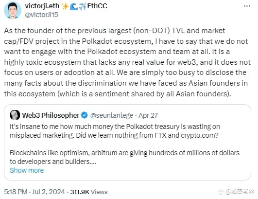 作为模组化区块链Manta Network创始人,Victorji.eth批评Polkadot生态圈“高度有毒”(highly toxic),甚至出现歧视亚洲人的现象。