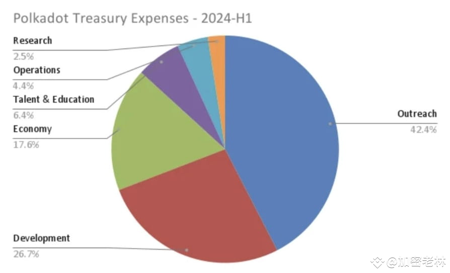以当前状况资产而言,Polkadot仍拥有充足的资金。但是,上半年的支出总支出高达8700万美元,远超2022年和2023年两年共4600万美元的支出总和,用途却引发了极大的争议,其具体包括推广支出3700万美元,主要为广告和媒体、线上线下社群建设活动以及大型会议等;开发支出2300万美元;经济支出1500万美元;人才与教育支出550万美元; 营运支出380万美元;研究经费210万美元。