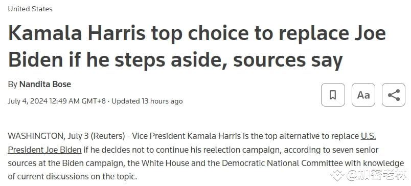 路透社援引拜登竞选团队、白宫和民主党全国委员会7位了解当前讨论情况的高级消息人士话称,如果拜登放弃竞选连任,哈里斯是接替拜登的首选。#美国大选#