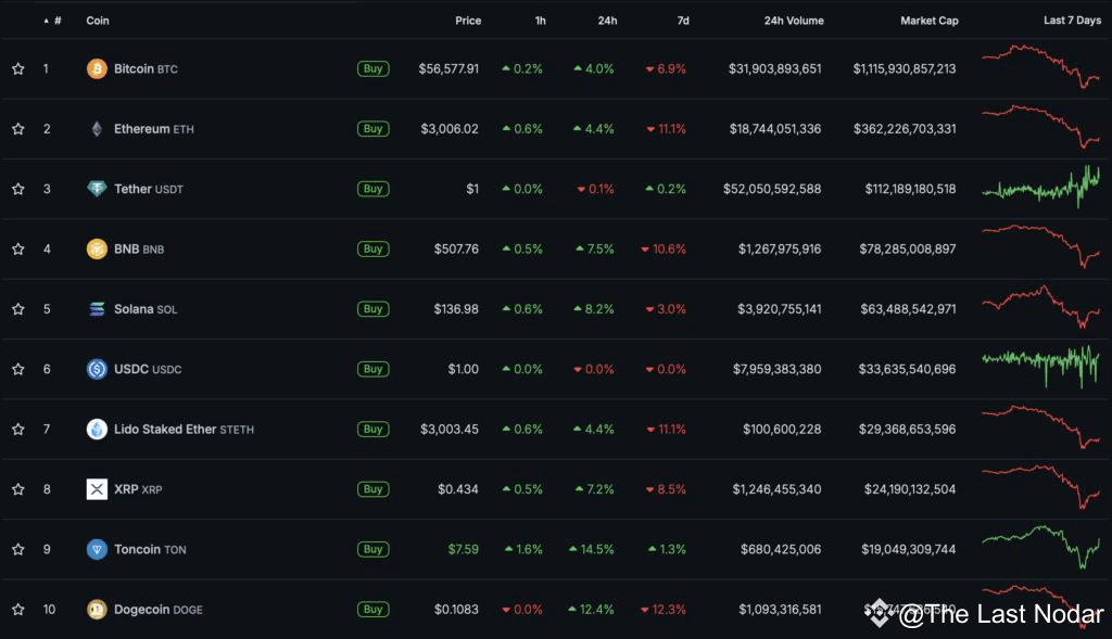 Вечером в пятницу, 5 июля, котировки первой криптовалюты вернулись к уровню #Bitcoin $56 000. За последние сутки актив прибавил 4%.