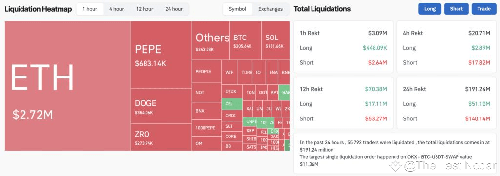 Согласно Coinglass, совокупный объем ликвидированных позиций за сутки составил $191 млн. Из них $140 млн пришлось на шорты.