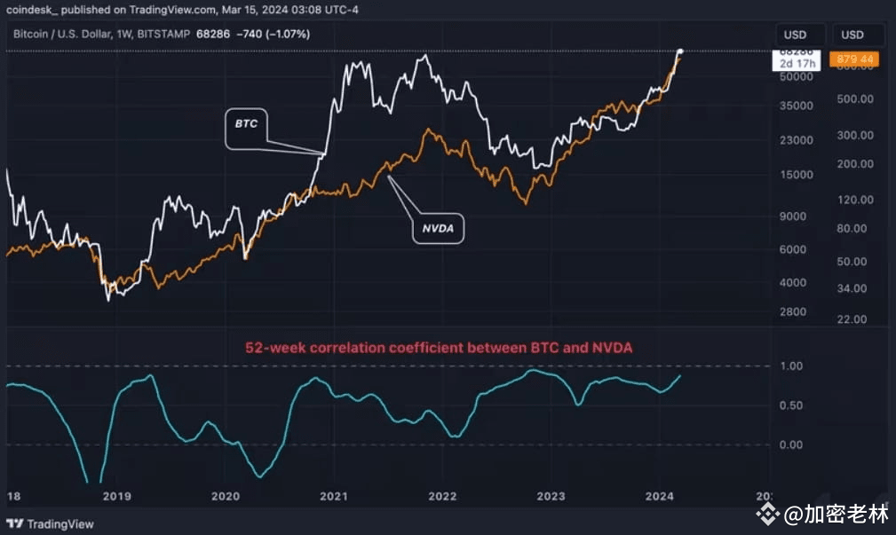 在年初自3月15日期间,比特币上涨60%,英伟达则上涨了77.5%。两者之间当时的90天相关系数已升至0.86,这是自2023年5月以来的最高水平。