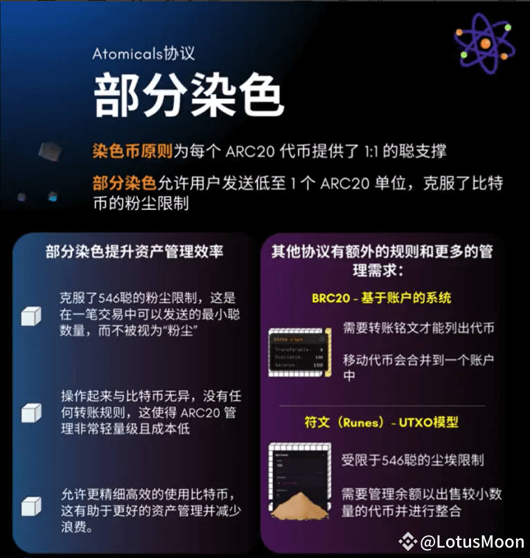 部分染色使 Atomicals 能够克服比特币的尘埃限制,与其它所有在Bitcoin 上的可替代代币标准相比具有重大优势: