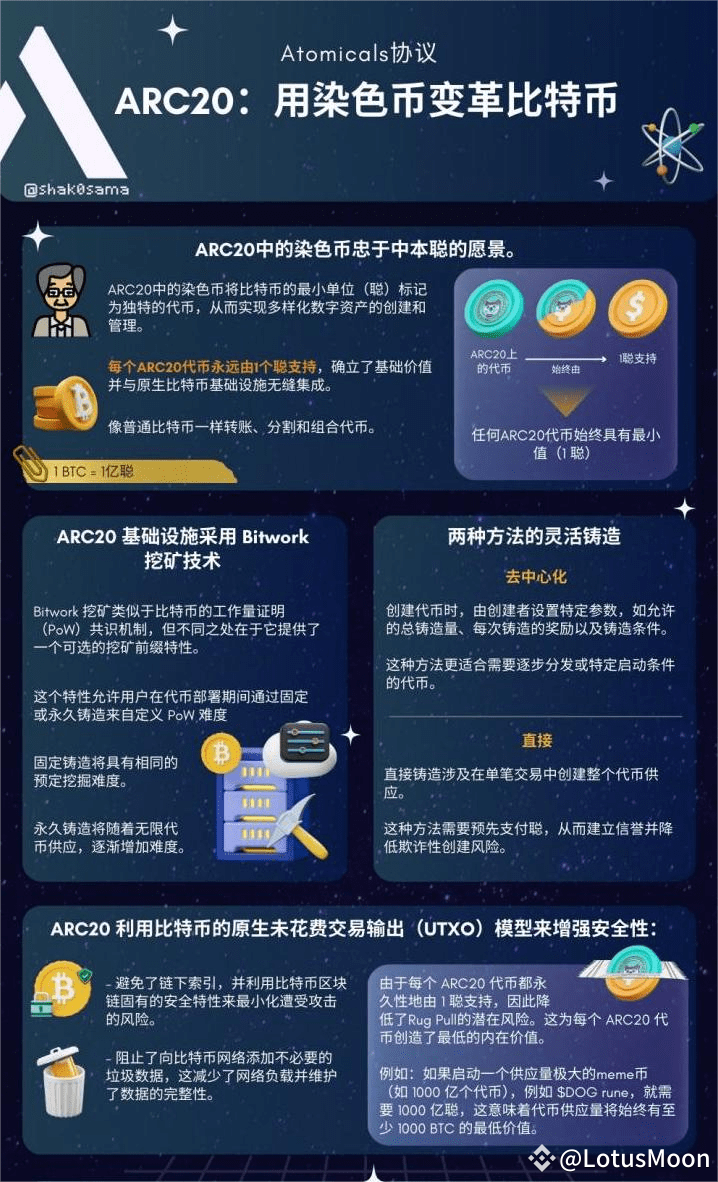 ARC20 可替代代币是在比特币上原生的染色币,由聪和PoW 挖矿1:1 支撑,并遵循去中心化的UTXO 模型。