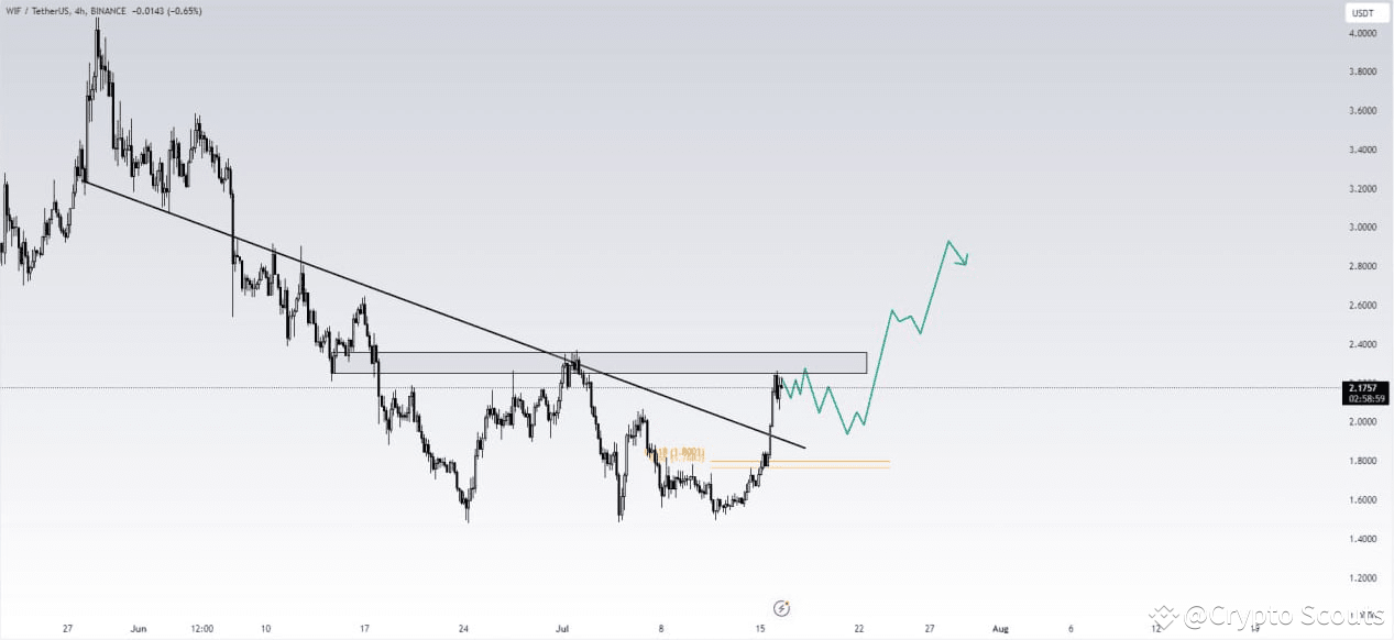 WIF прорвался выше основной нисходящей трендовой линии на 4-часовом таймфрейме, что указывает на силу и потенциальный бычий импульс. По мере приближения к сильному уровню сопротивления, есть ключевые зоны, на которые стоит обратить внимание для возможных покупок.