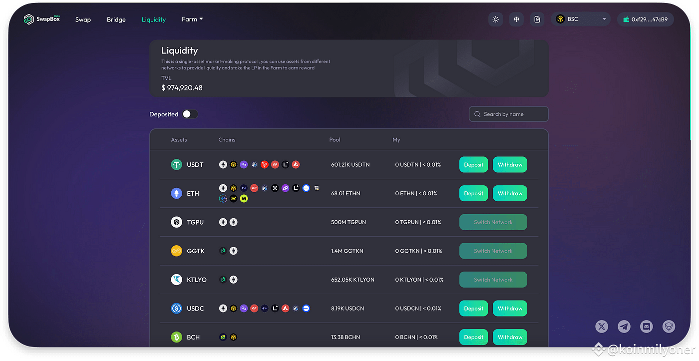 SwapBox liquidity pools enable users to bridge assets over multi-chains. For example, one of the most common assets-USDT, are issued in different blockchains. In order to make USDT available for multichain users, we added liquidity on different blockchains on SwapBox, so users can crosschain USDT over different networks much easier, instead of relying on exchanging and withdrawing on DEX. So far we have deployed USDT, ETH, TGPU, GGTK, BCH, … using the liquidity feature.