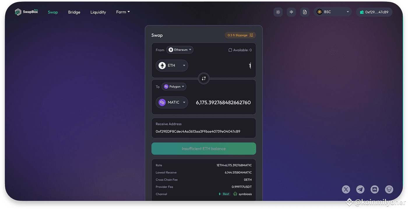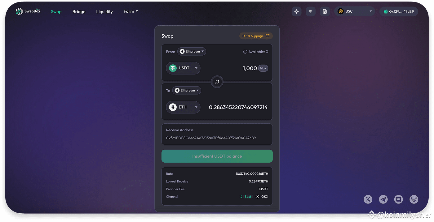SwapBox provides swap and cross-chain swap features, aggregates liquidity from multiple decentralized exchanges, and automatically locates the best swapping route for users.