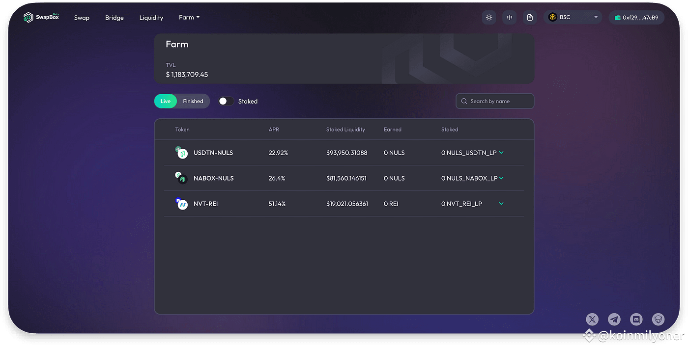 L1 farm allows users to stake LP tokens on SwapBox and earn incomes on the networks supported by Nabox Wallet. Currently, there is no live mining session on L1 farm.