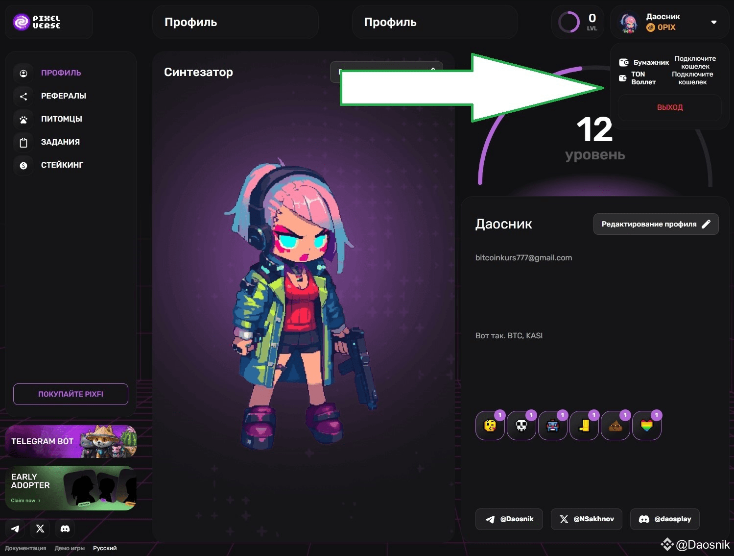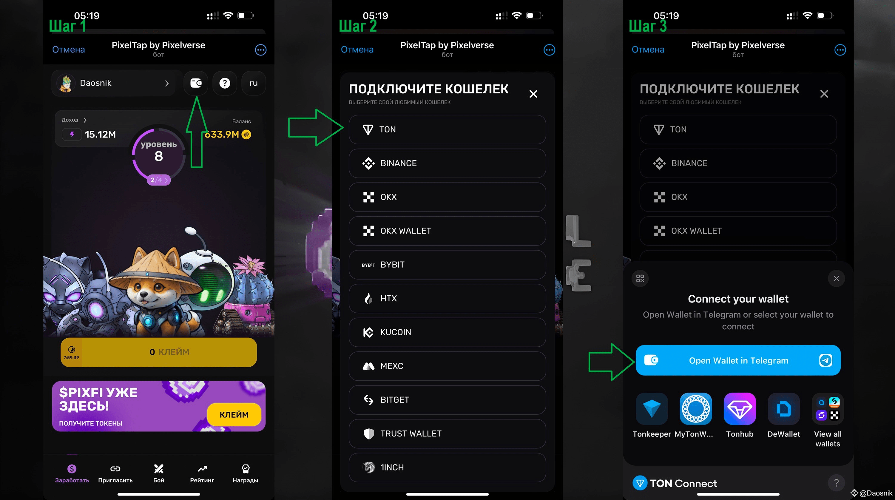 Заходим в PixelTap выбираем кошелек TON всё как по стрелкам на скринах.