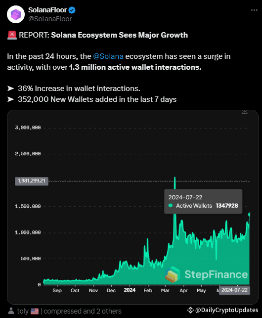 The Solana ecosystem has experienced a remarkable surge in activity over the past 24 hours, with over 1.3 million active wallet interactions recorded. This impressive growth highlights Solana's increasing adoption and engagement among users.