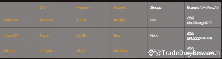 Prover Nodes: Acting as the guardians of integrity, prover nodes cryptographically verify blocks generated by sequencers, upholding the security of the network. They have minimal hardware requirements as they only validate blocks, such as AWS t4g.nano ($0.004/hour).Full Nodes: These nodes maintain a complete copy of the blockchain ledger and validate blocks based on proofs provided by provers. They have moderate hardware needs for verifying proofs, such as AWS Im4gn.xlarge ($0.4/hour).