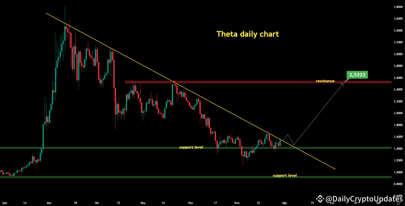 Support Levels: The current support level for Theta is around 1.400. This level serves as a crucial point where buyers step in, preventing further price declines.
