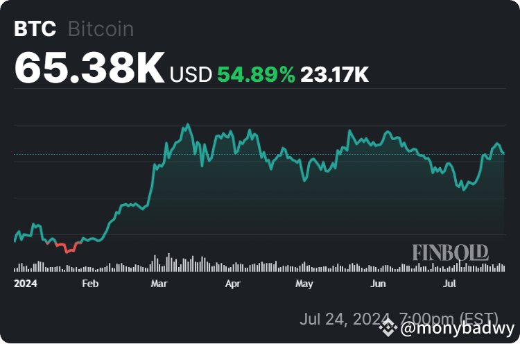 As of July 25, 2024, Bitcoin is trading at $65,380, showing recent declines but a notable increase since the year's start. This reflects Bitcoin's inherent volatility yet overall strong performance.
