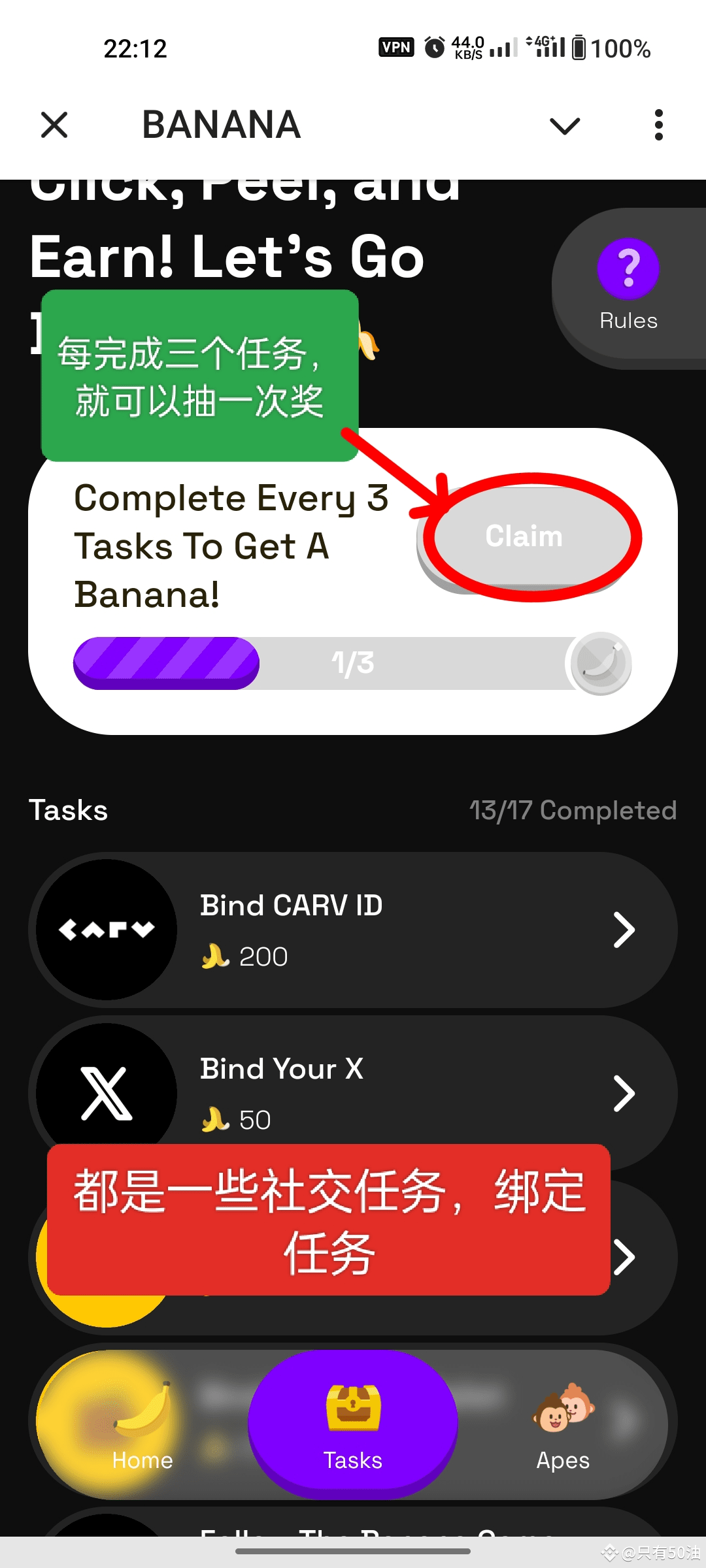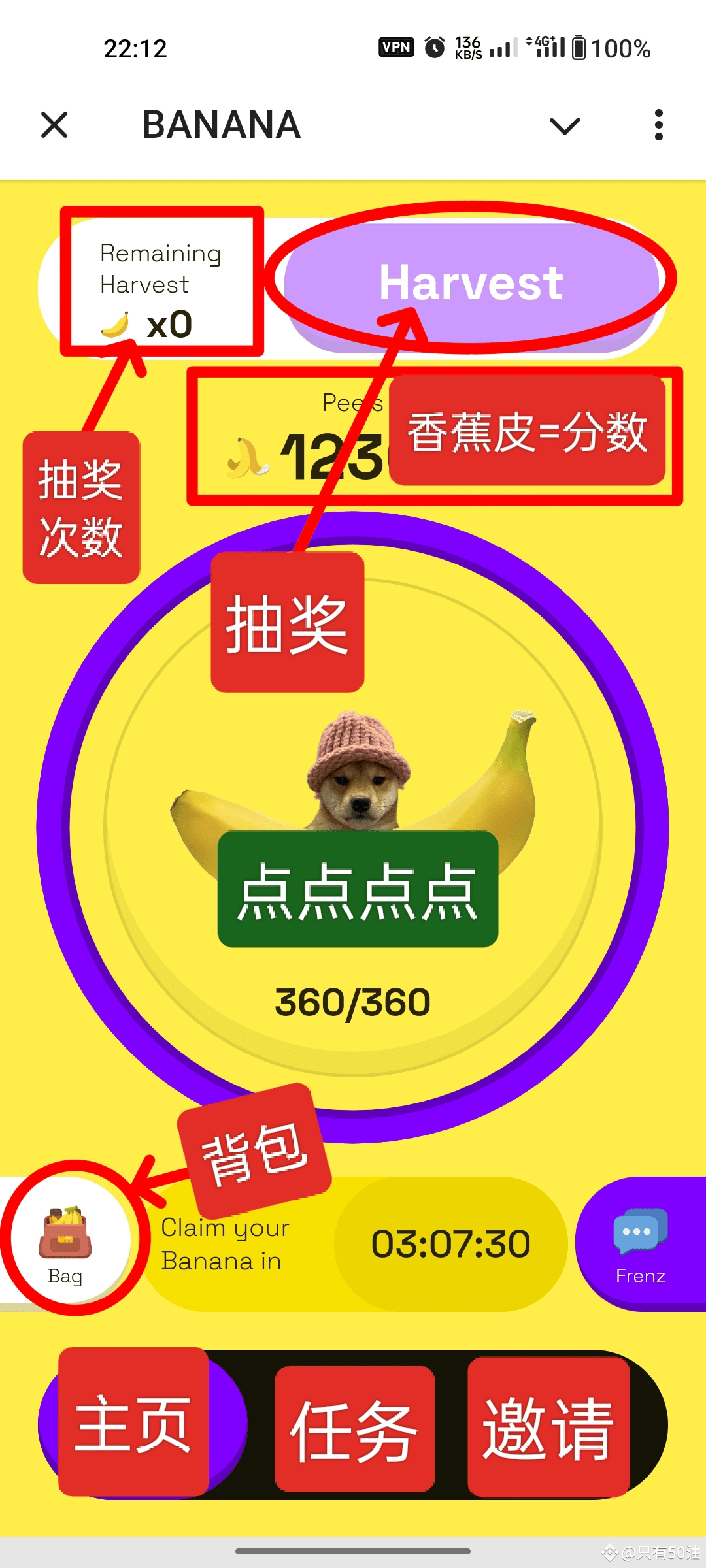 又发现了一个telegram 小游戏。目前国外很火。Carv开发的一个小游戏。Carv目前已融资到了5千多万了。这个游戏有趣的地方是,可以提前提现。如果运气好,抽到超稀有香蕉,可以把香蕉卖掉换成USDT。游戏里面,香蕉皮是积分,可能是未来空投的代币,这个游戏也有机会获得$carv 代币。