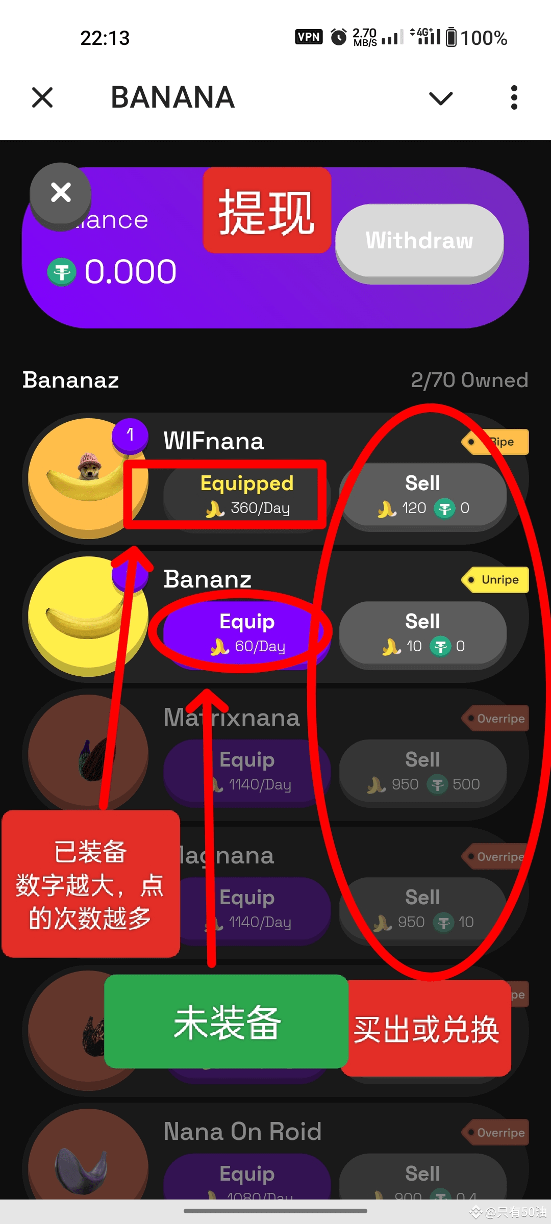 背包页面-里面有好多香蕉,抽奖后会得到香蕉。有四种香蕉,生的unripe,熟的ripe,完全成熟的fully ripe,超熟的over ripe。每个香蕉都可以装备或兑换香蕉皮(积分)。装备稀有的香蕉,能点点的次数就会增加。当然也可以把香蕉直接兑换到香蕉皮。稀有香蕉也可以直接兑换USDT。提现的话好像最少要0.5U(今天刚玩,没提过😁😁)。