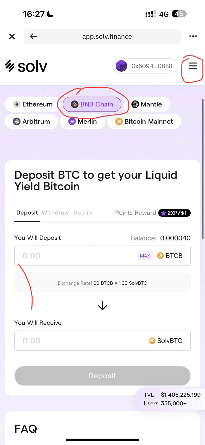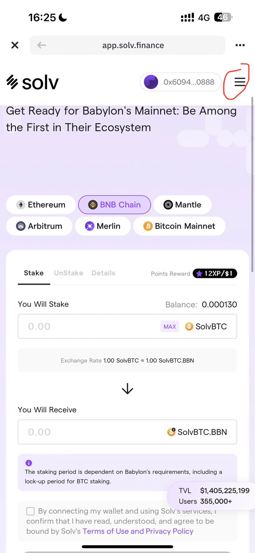 2. 点开活动页面,链接你的#币安Web3钱包 右上角三杠,选择solvbtc,选择币安链,把btcb换成solvbtc