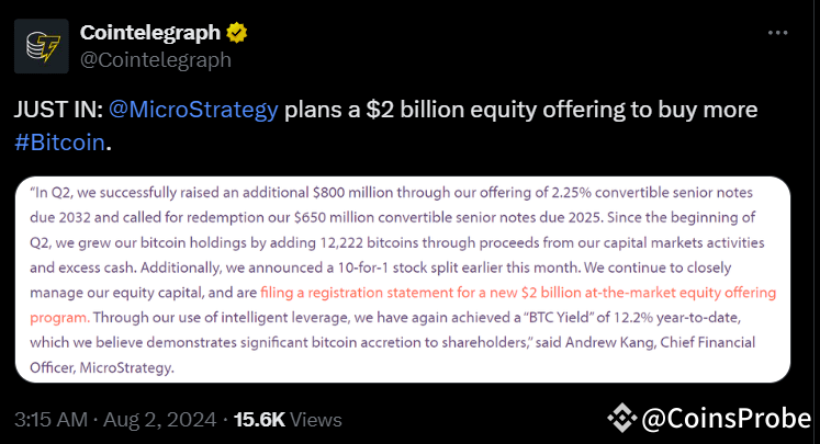 MicroStrategy, the American software firm led by CEO Michael Saylor, is making waves in the cryptocurrency world again. Despite reporting a net loss in the second quarter, the company has announced plans to raise a staggering $2 billion to buy more Bitcoin $BTC as reported by Cointelegraph.
