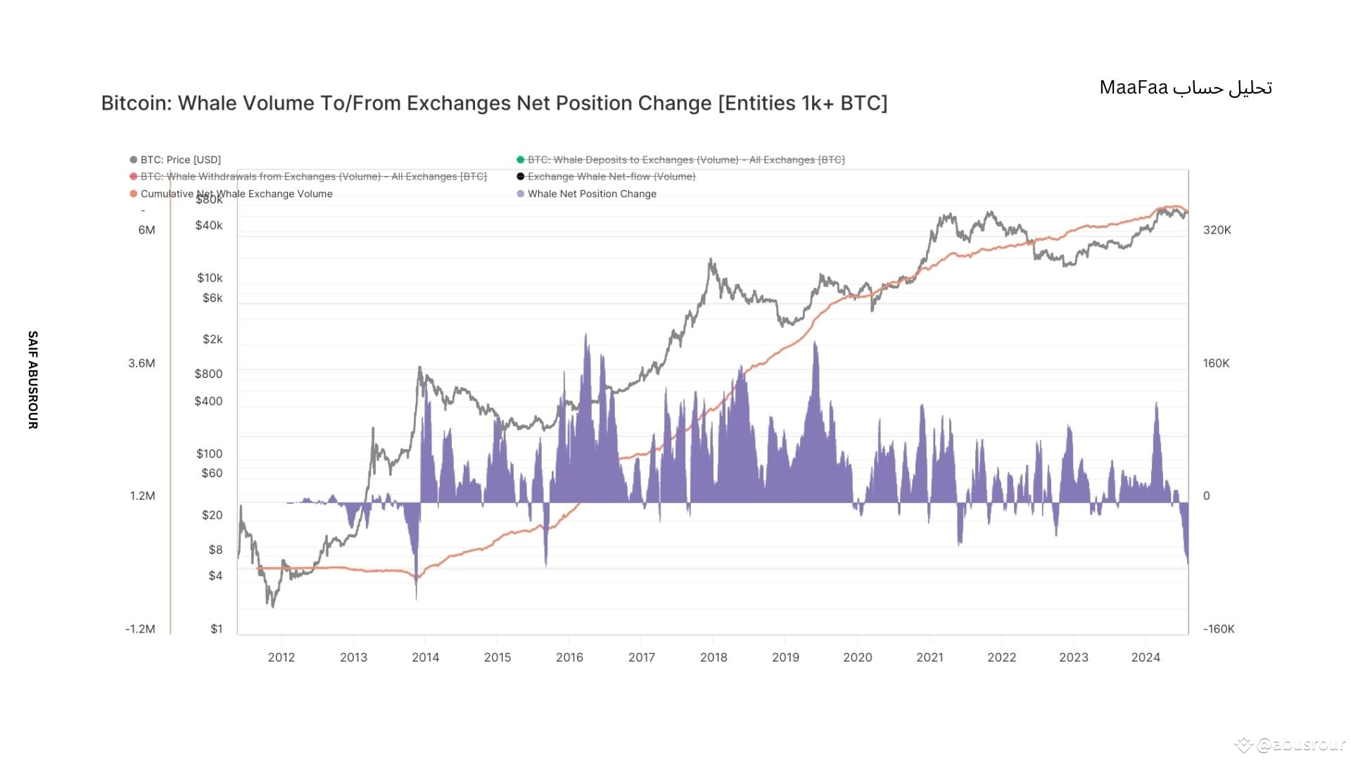 يمكن ملاحظة أن هناك زيادة كبيرة في التغير في صافي مركز الحيتان في الفترة الأخيرة، حيث أصبحت الحيتان تنقل كميات كبيرة من البيتكوين من منصات التداول إلى المحافظ الخاصة. قام الحيتان في عام ٢٠٢٤ بإضافة أكثر من ١١٠,٠٠٠ بيتكوين أسبوعيًا في المتوسط، مقارنة بـ ٦٠,٠٠٠ بيتكوين أسبوعيًا في عام ٢٠٢١ و أصبح هناك ١,٦٥٦ عنوانًا يحمل كل منها ما لا يقل عن ١,٠٠٠ بيتكوين اعتبارًا من ١ أغسطس ٢٠٢٤.