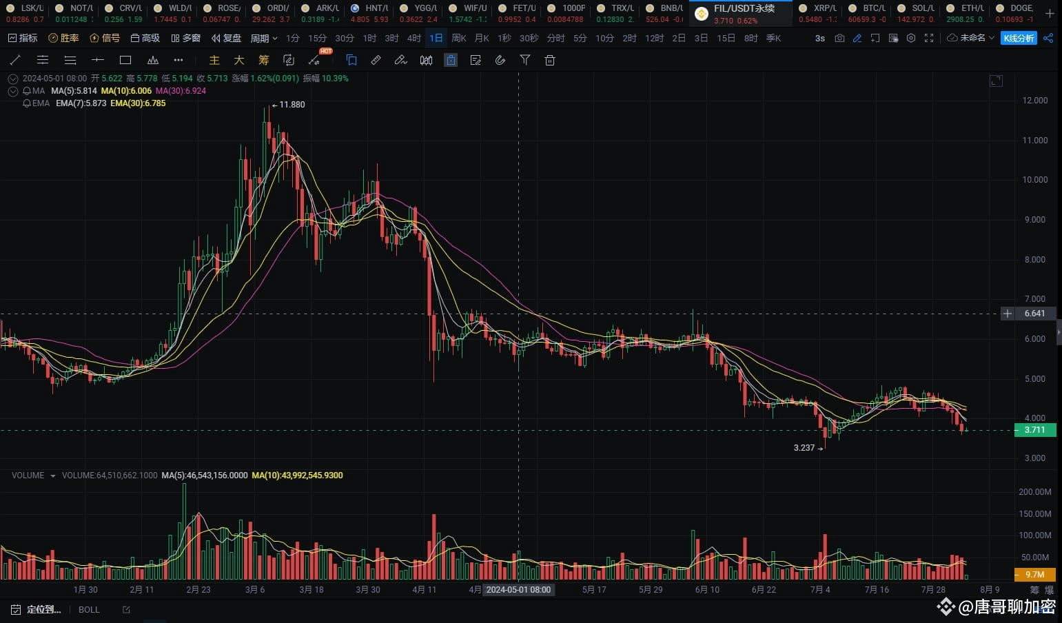 FIL目前在3.7美元附近波动,接近最近的支撑和阻力区间。这个价格点对FIL的走势具有重要的技术意义,可能影响短期及中期的走势。