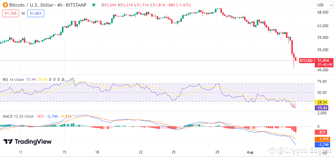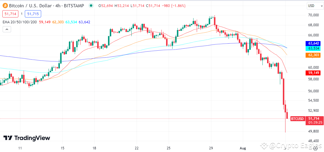 Bitcoin (BTC) has recently seen a sharp decline, emphasizing increased market volatility and negative economic factors. Now trading at $51,633.31, Bitcoin has dropped by 13.26% in the last 24 hours, intensifying a broader downtrend over recent weeks. It briefly hit $49,000 on major exchanges like Binance, marking a significant fall from its peak of over $70,000 just a week ago.