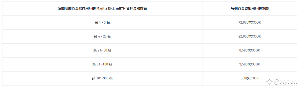 在ETH鏈或是Mantle鏈上質押超過0.02ETH(也就是持有超過0.02 mETH)的活動用戶,從中抽取5600名獲獎者瓜分1310000 COOK(每人233 COOK)
