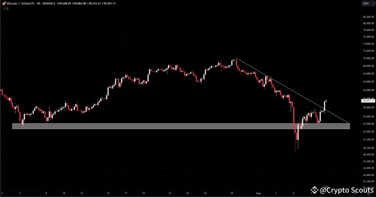 Биткоин недавно показал сильное восстановление, оттолкнувшись от горизонтального уровня поддержки. Цена успешно пробила нисходящую линию тренда, что свидетельствует о смене настроений на рынке.