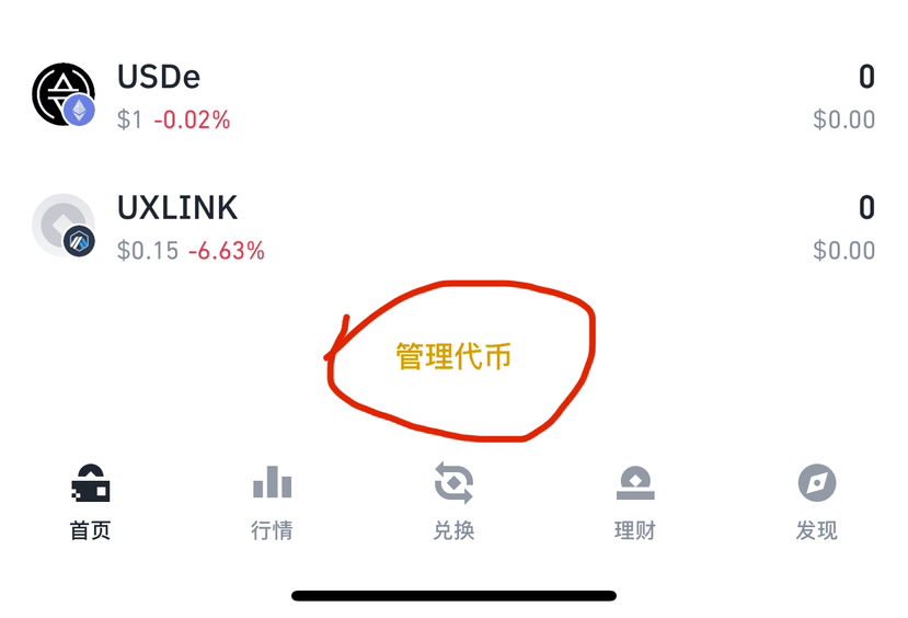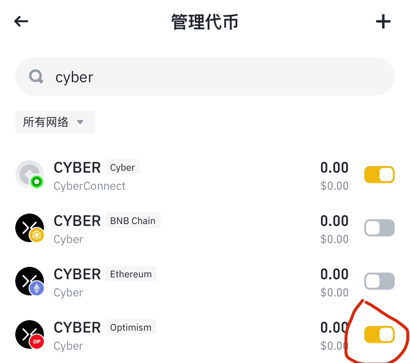 第五步:在web3钱包首页最下面,选择管理代币,搜索“cyber”,把图示的op网络下的cyber后面方框按钮选上。