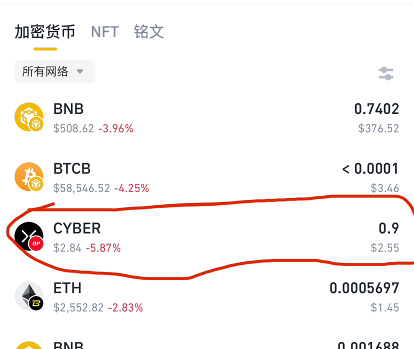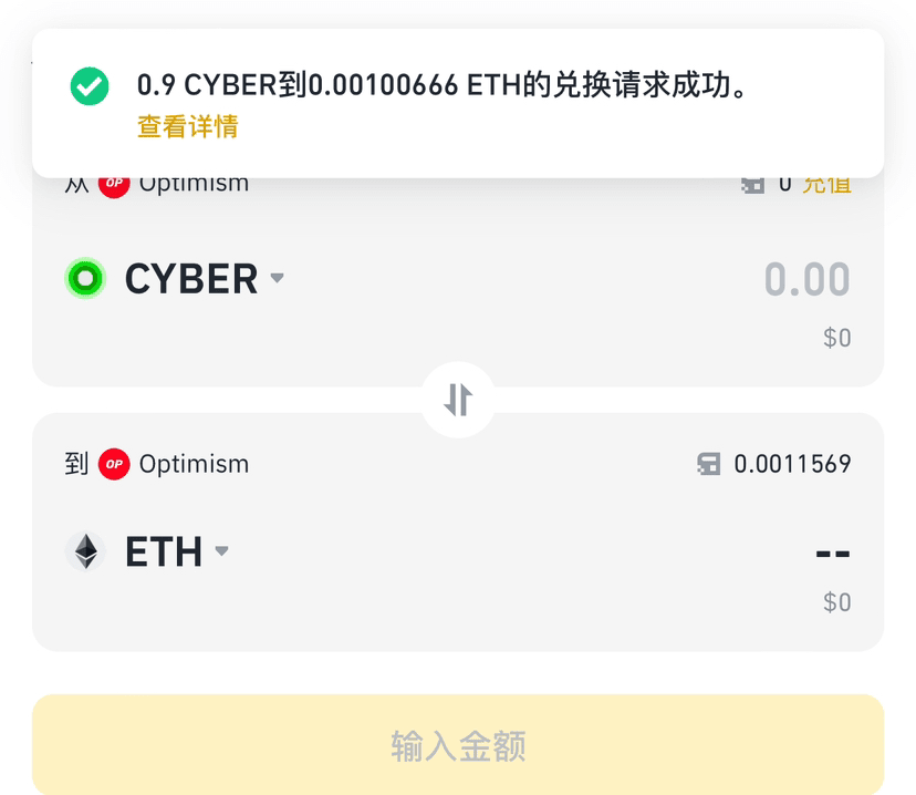 第六步:web3首页刷新一下就可以看见了cyber代币了。点进去,在概览里面兑换成op网络的eth。(如果显示不支持该币种兑换,是网络问题,大退多刷新几次)