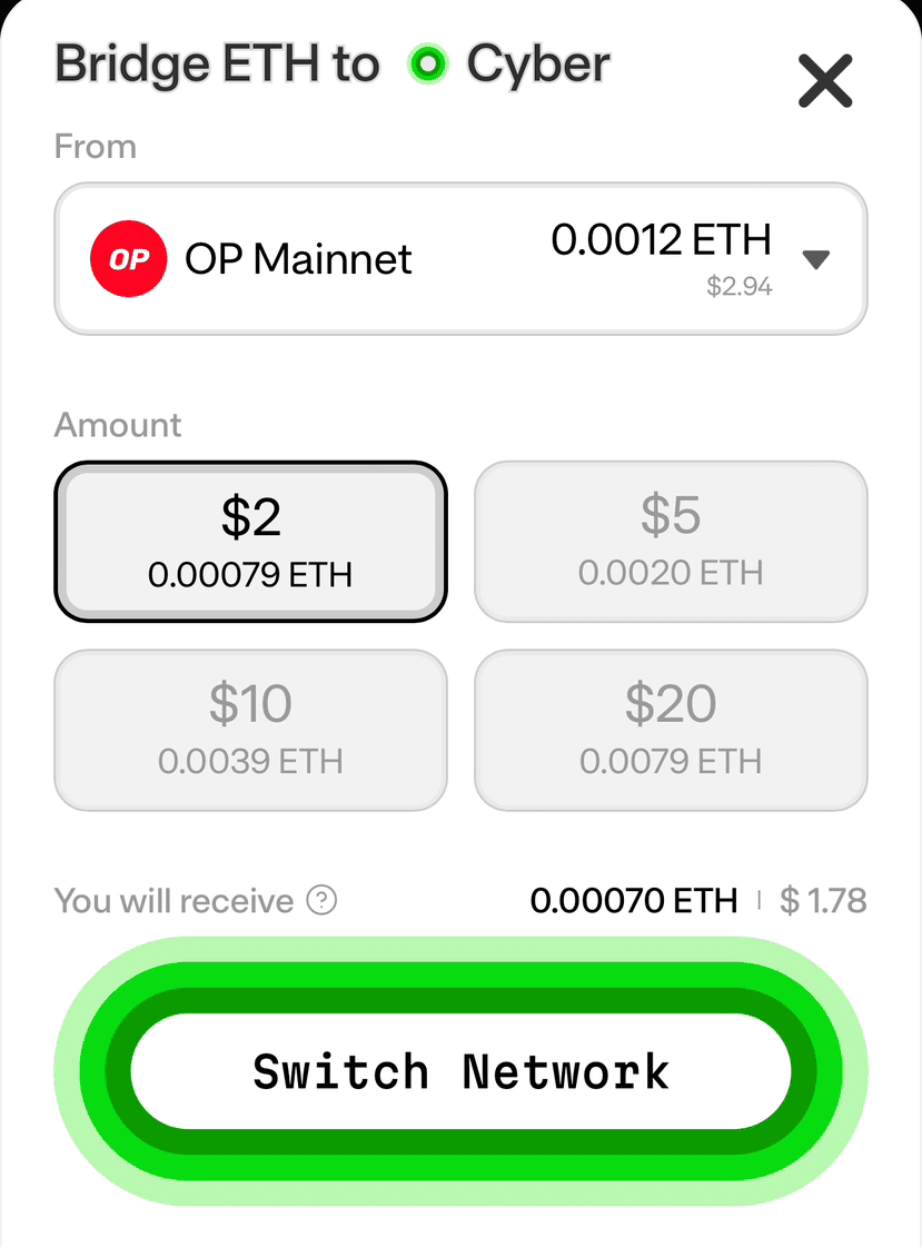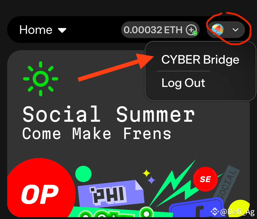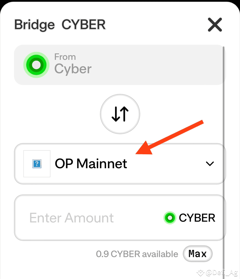 第七步:换好的op网络的eth可以再通过cyber活动界面上面+号跨到cyber网络去继续签到。