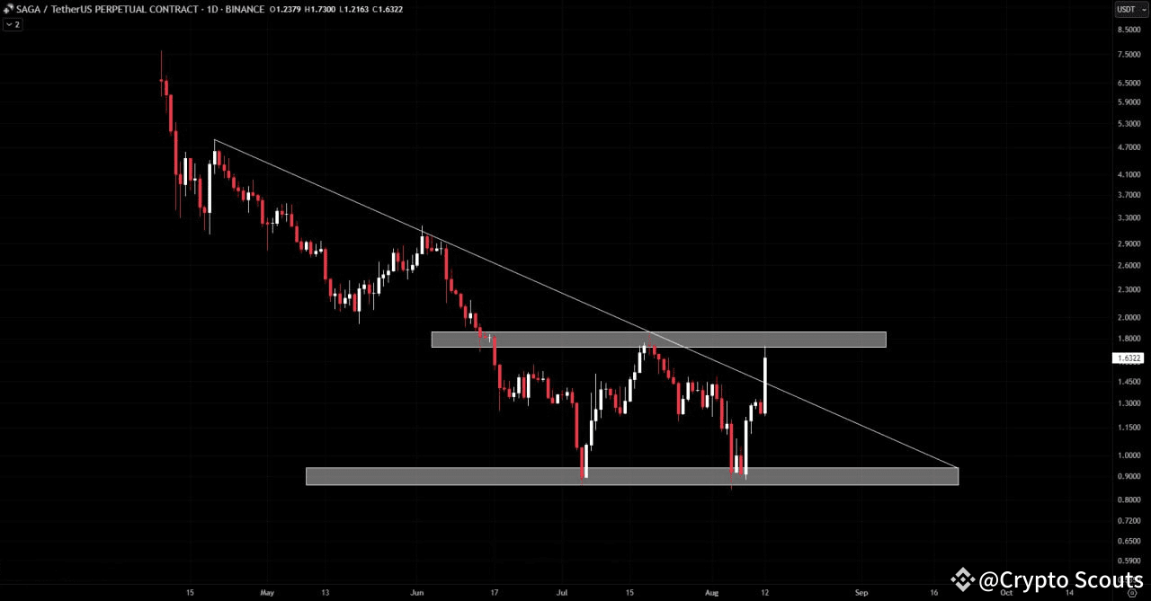 На графике видно, что SAGA пробила нисходящую трендовую линию с высоким объемом торгов, что указывает на сильный бычий импульс. Однако цена сейчас находится под горизонтальным уровнем сопротивления, что создает неуверенность в дальнейшем движении.
