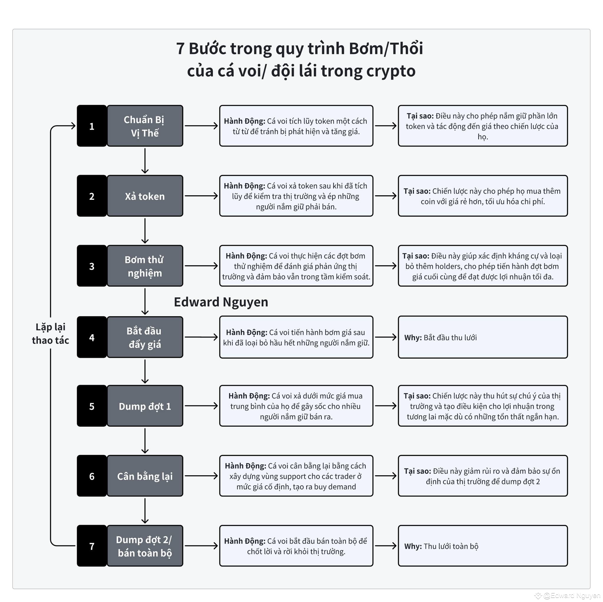 Đối với đa phần các nhà đầu tư/ trader, điều họ suy nghĩ duy nhất về Market Maker/ đội bơm lái là pump/ dump. Nhưng đối với Cá Voi, quy trình này có tới 7 bước.
