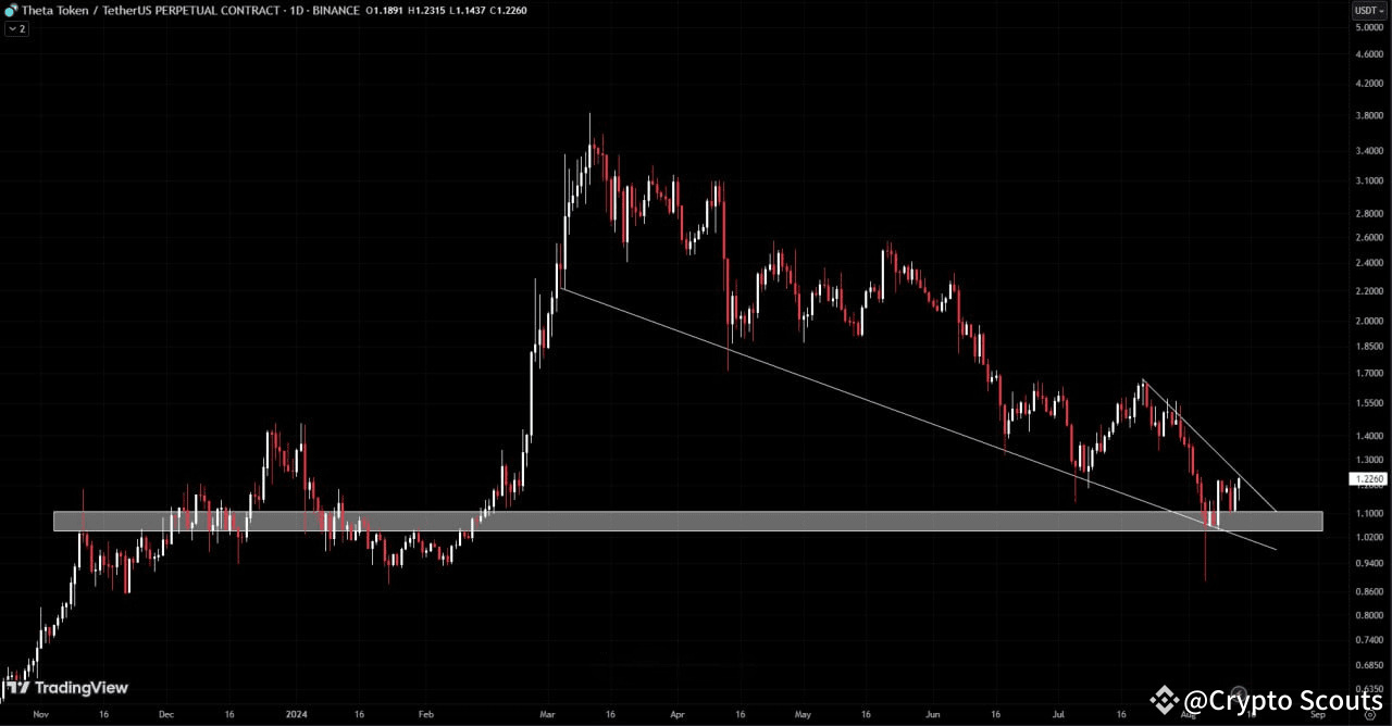 На графике видно, что после отскока THETA столкнулась с сопротивлением на уровне трендовой линии. Для подтверждения бычьего тренда цена должна пробить эту трендовую линию и успешно протестировать её снова. Если ретест окажется успешным, это может означать дальнейшее восходящее движение.