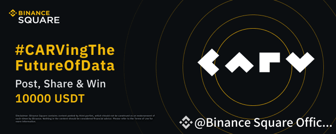 Post content on the square using the hashtag #CARVingTheFutureOfData for the opportunity of sharing the rewards. We’re looking forward to hearing from you on your insights and thoughts about CARV Protocol and how it could benefit users to own, share, and earn from their data. You must tag @CARV and the hashtag #CARVingTheFutureOfData #BinanceWeb3Airdrop and include your views on: