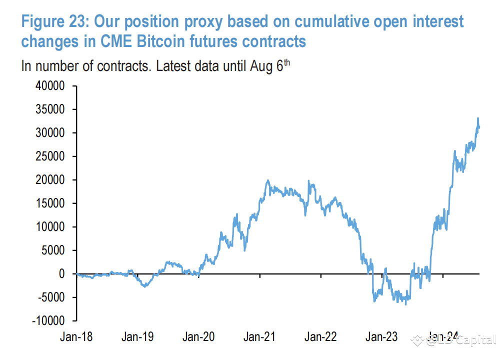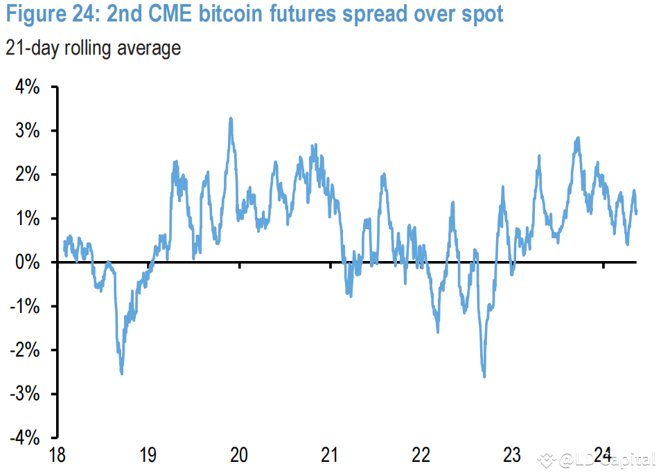 相比之下,美国期货市场玩家的去风险行为有限。这从CME大饼期货合约的持仓变化中可以看出,期货曲线的正价差表明期货投资者仍然保持一定的乐观情绪。