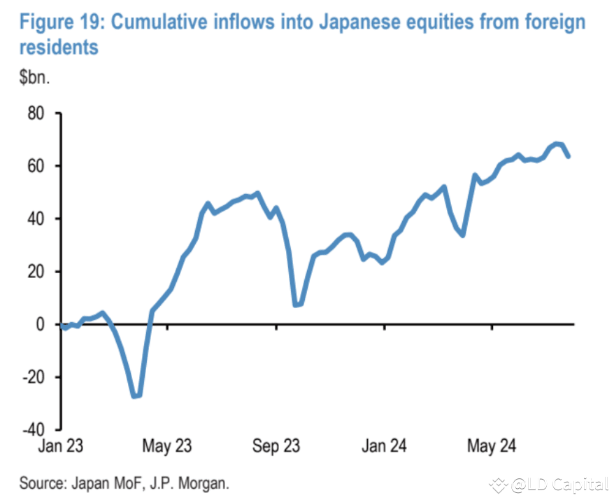 第一部分是外国投资者购买日本股票,他们为了保险起见,会做一个卖空等值规模日元的衍生品。最近由于日股下跌日元上涨,所以这些投资者两边都亏损,不得不把整个组合平仓。通过日本政府统计的外国人对日股投资的金额估计这种交易的规模大概有600亿美元。