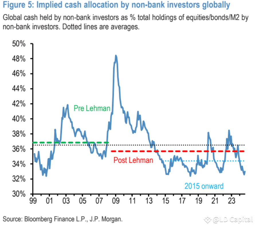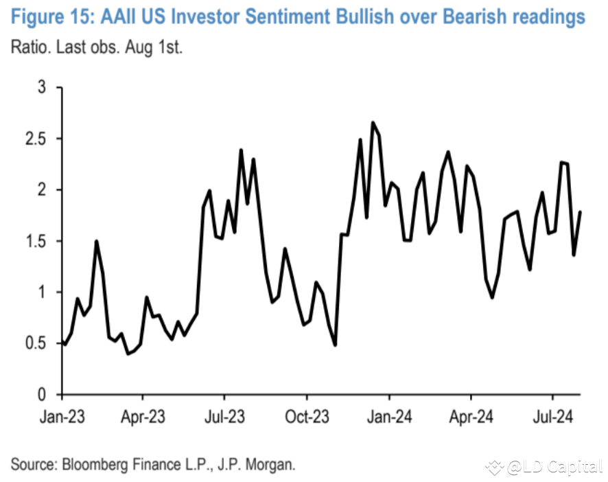 当前投资者现金配置比例极低,这表明投资者的资金更多集中在股票和债券上,低现金配置可能会增加市场在面临压力时的脆弱性,因为当市场下跌时,投资者可能需要卖出资产以获取现金,这可能加剧市场波动。