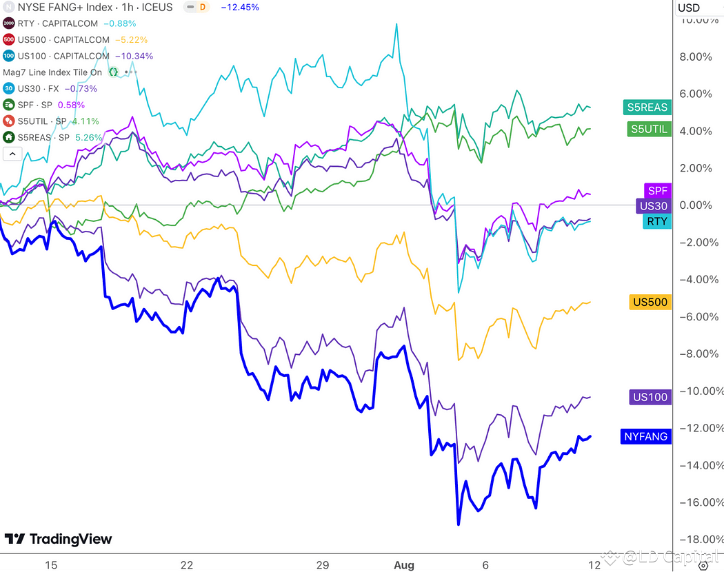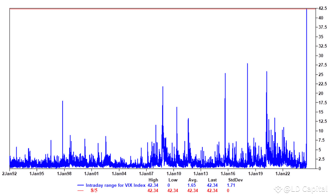 美股在周一的抛售后出现了约4.5%的峰谷波动,这是2019年新冠恐慌以来波动最大的一周。波动意味着风险同样意味着机会,我在周一盘中迅速录制了一期视频,讲解了为什么除了日元之外的抛售都是过度恐慌,对于主流加密、股市来说这是一个黄金坑,对于债券来说这是短期高点。总结来说,主要是