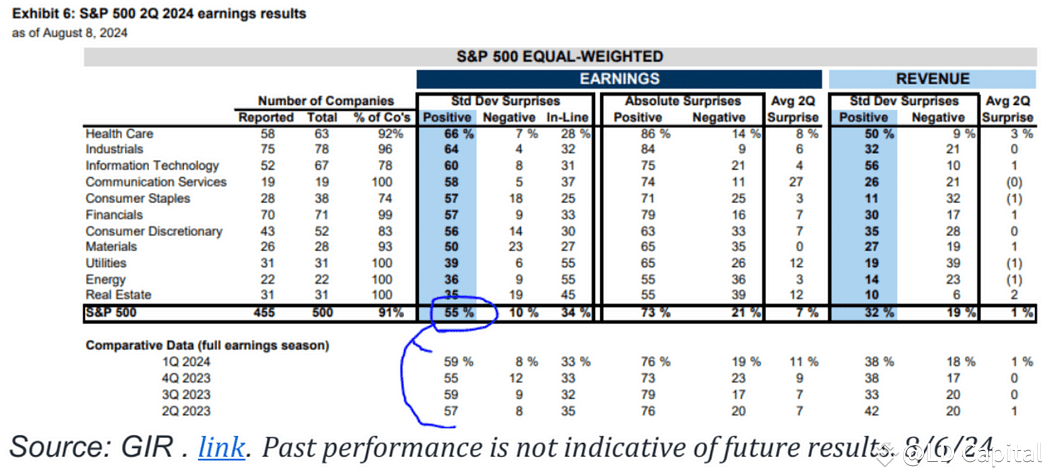 从图表中可以看到,各个行业的表现存在较大差异。例如,医疗保健(Health Care)、工业(Industrials)和信息技术(Information Technology)行业的表现较好,超预期的公司比例较高,而能源(Energy)和房地产(Real Estate)行业的表现相对较差。