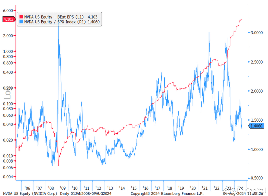 其24个月的远期PE目前25倍,接近过去5年的最低点(大约20倍),对SPX的pe溢价背书从1.8倍将至1.4倍,这表明NVIDIA的估值逐渐趋于合理。