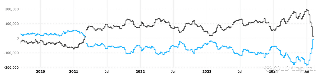 日元套利交易:如果日元升值,这个操作就会亏钱。现在虽然日元的交易从超卖变到超买,但整体来看,这个4万亿美元的大交易并没有大规模解除。
