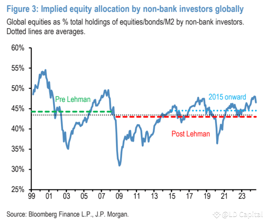 尽管最近几周由于股票价格下跌和债券配置的急剧增加,股票配置有显著的减少,但当前的股票配置比例(46.5%)仍然显著高于2015年后的平均水平。根据J.P. Morgan的计算,如果要使股票配置回到2015年后的平均水平,股价需要从当前水平进一步下跌8%。