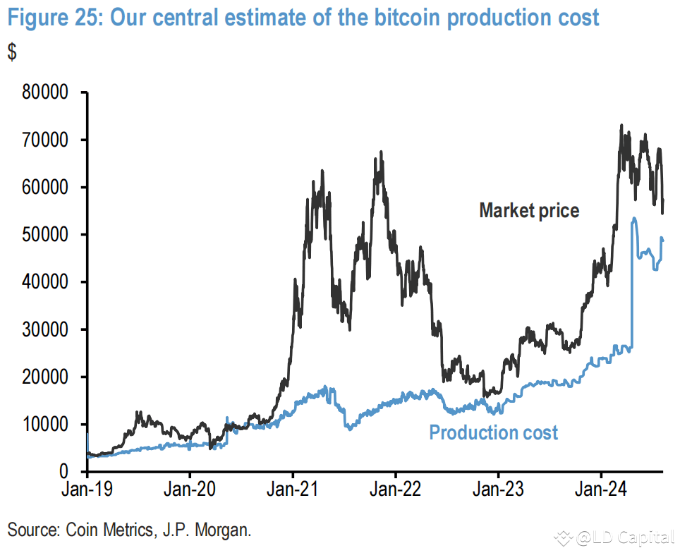 大饼上周最低到了49,000美元附近。这个价格水平与摩根大通估算的比特币生产成本相当。如果比特币价格长时间保持在这个水平或以下,将对矿工构成压力,进而可能对比特币价格施加进一步的下行压力。