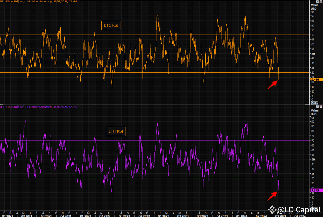 经历了自FTX危机以来最急剧的回调,大饼价格下跌超过15%后有所回升。由于这次回调的触发因素并非加密货币市场内部事件,而是来自传统市场调整的外部冲击。技术面也严重超卖,程度跟去年816时几乎一样,当时大饼一波由2w9下杀到2w4,后面经历了两个月的震荡盘整。
