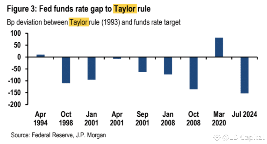 JPM研究根据泰勒规则(Taylor Rule)计算,美联储的联邦基金利率目标应当在4%左右,比当前的利率低150个基点。美联储有理由迅速调整政策,使其更符合当前的经济状况。