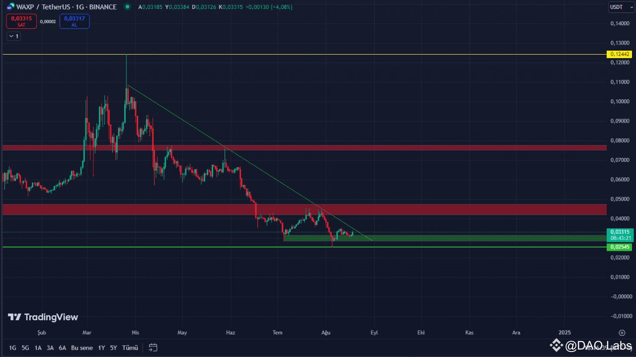 WAXP bounced off the 0.03170 support, but due to the overall bearish market structure, the 0.027 areas were tested again. However, after a sharp drop, the price found support at the 0.02545 level and began to move upward once more. Unless the 0.04253 area is broken during the week, the price will continue to exhibit accumulation behavior.