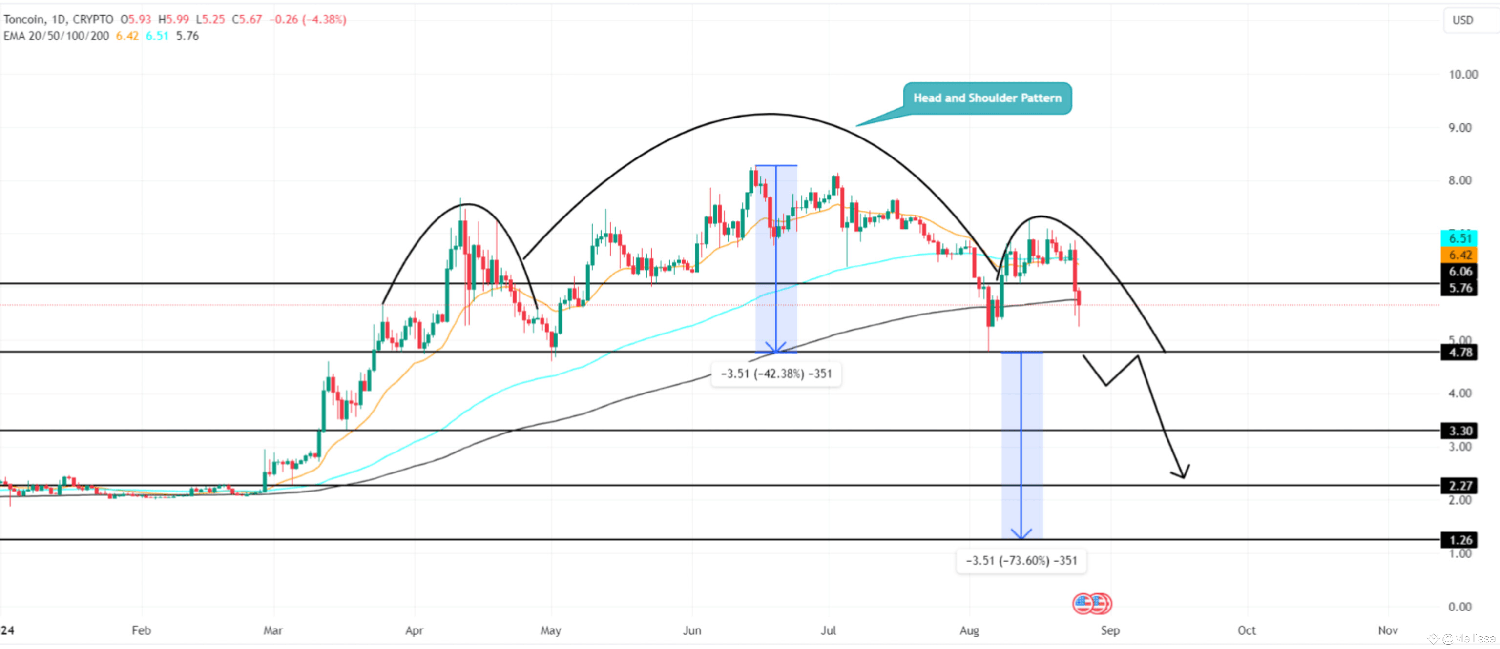 The falling TON price recently breached below the 200-day EMA support, strengthening the selling influence on this asset. If the bearish momentum persists, the sellers could drive a 14.7% fall to challenge the $4.78 multi-month support.potential breakdown from the $4.8 floor will signal a major correction and drive the asset price to $3.8, followed by $2.3 and $1.37.Conversely, if Pavel Durov is released following interrogation and potential international objections, the Toncoin price could rebound from $4.7 support to invalidate the bearish thesis.