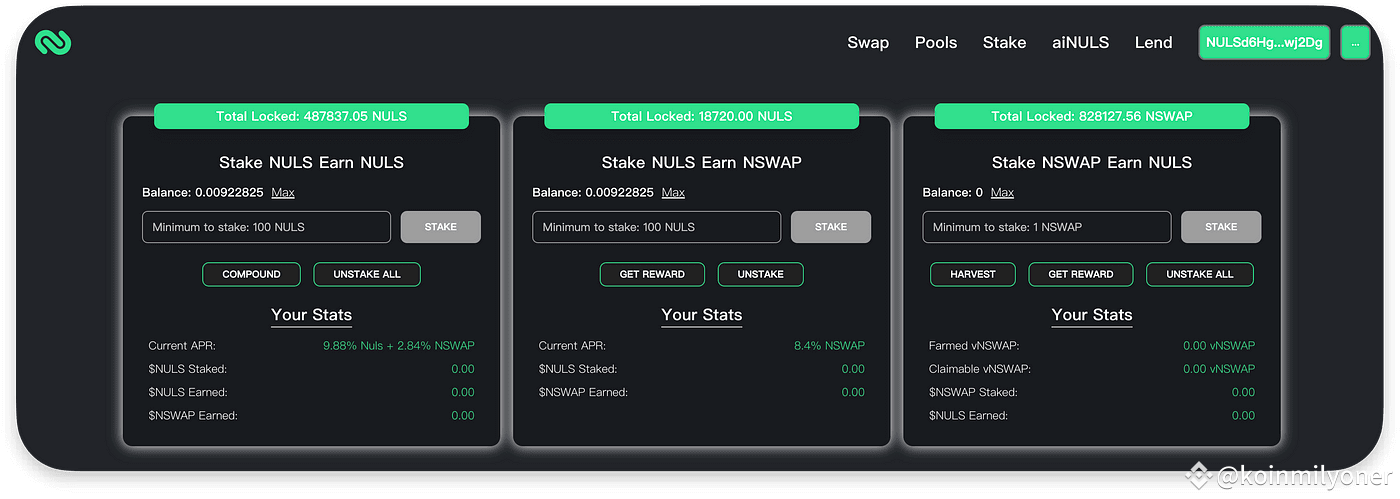 Stake NULS to earn $NSWAP and $NULS(APR 9.88% + 2.84% )